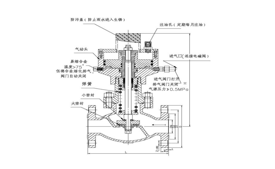 ●緊急切斷閥結構尺寸圖:切斷閥由閥體,閥瓣,閥桿,密封圈,強力彈簧,活塞式氣缸,易熔合金塞,防水玻璃罩,螺栓緊固件,金屬石墨墊片,連接桿組成??膳涮纂姶砰y線圈,空氣過濾減壓閥,回訊器(可加載手動裝置)構成自動化控制流體閥。應用在儲罐,氨站,液化氣加氣站做為應急開關的閥門。