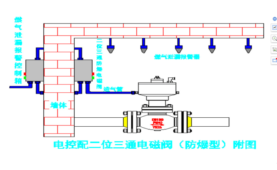 ●緊急切斷閥接線示意圖:與氣體報警器連接,通過氣體泄漏探頭探測到介質(zhì)在空氣中的密度,給主機信號報警,主機切斷電源排空氣源壓力,閥門泄壓關閉。