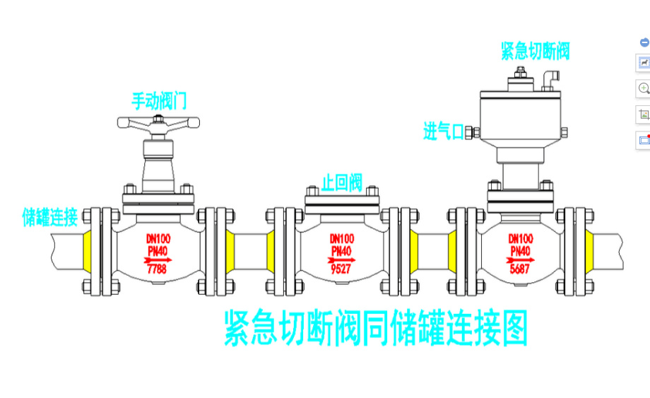 ●緊急切斷閥安裝示意圖:安裝在儲罐的輸入口管道,前面與液氨截止閥、液氨止回閥相連接,液氨截止閥保持常開狀態(tài),止回閥防止介質(zhì)倒流作用,如果介質(zhì)在輸入和輸出是同一條管線,不能安裝止回閥。