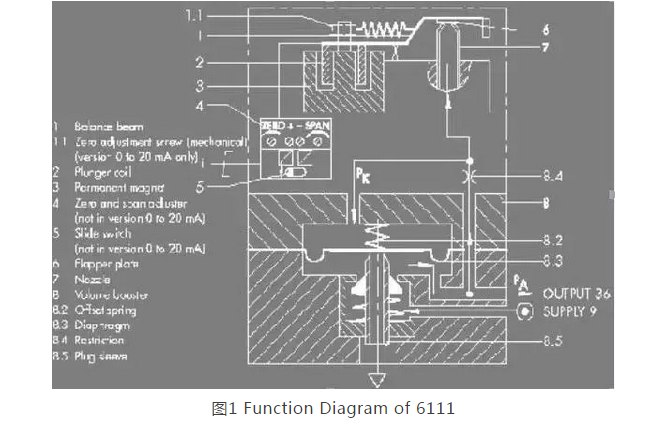 電/氣轉換器原理 隨著儀表技術的發(fā)展,氣動儀表領域已逐步被電動儀表和計算機控制所占領,現(xiàn)在只有在一些特殊的場合還在使用氣動儀表,作為儀表中的閥門附件“定位器”也由原來的氣動閥門(P/P)定位器逐步由電/氣(E/P)閥門定位器所代替。 那么在電/氣閥門定位器中輸入的電信號是如何轉換成氣信號的呢?我們以SAMSON 6111 型電/氣轉換器為例介紹一下它的工作原理(見圖1):